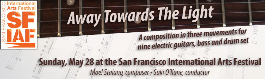 Moe Staiano's "Away Towards the Light," is an exploration of tonal interplay and contrasting rhythms for nine electric guitars, bass and drums composed in three movements, and is his first composition for multiple electric guitars.